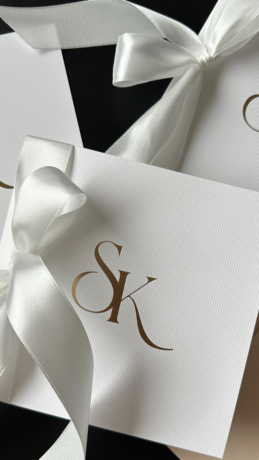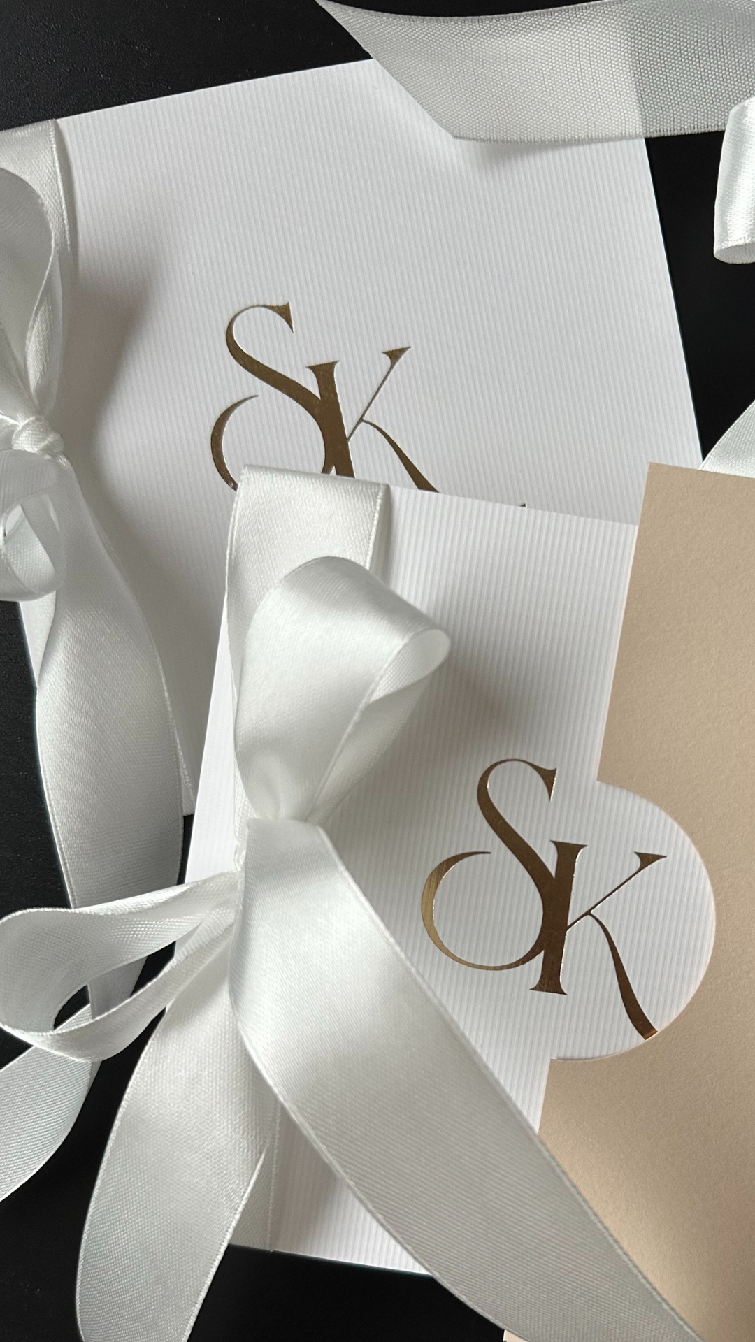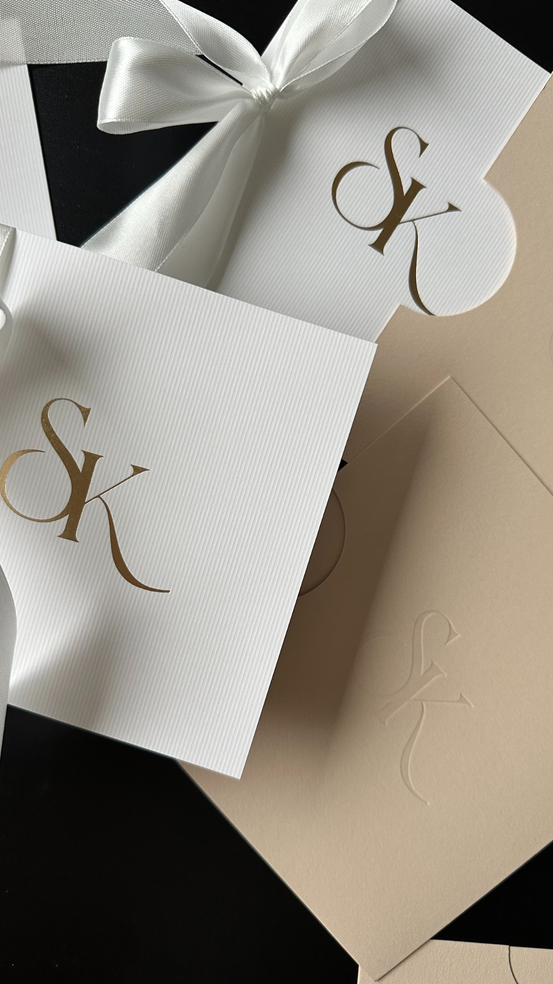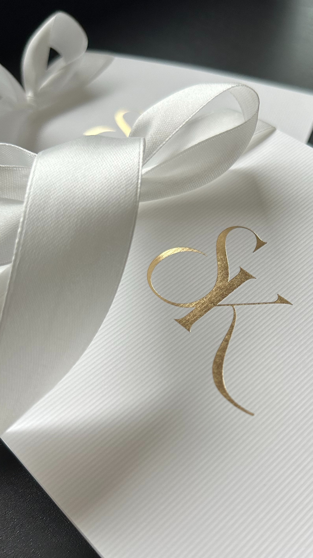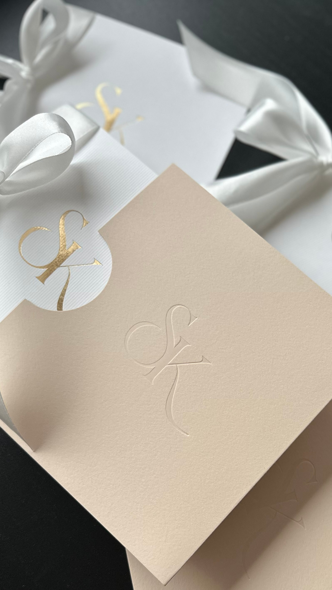 Zaproszenie o wymiarach 14 x 14 cm z hot stampingiem inicjałów,